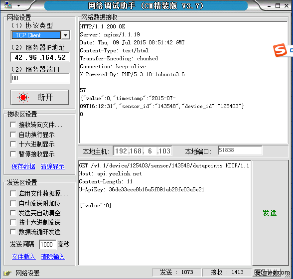 然后我們先測試下通信是否能成功,可以使用網絡助手作為一個服務器端,作為一個設備向yeelink服務器發送命令