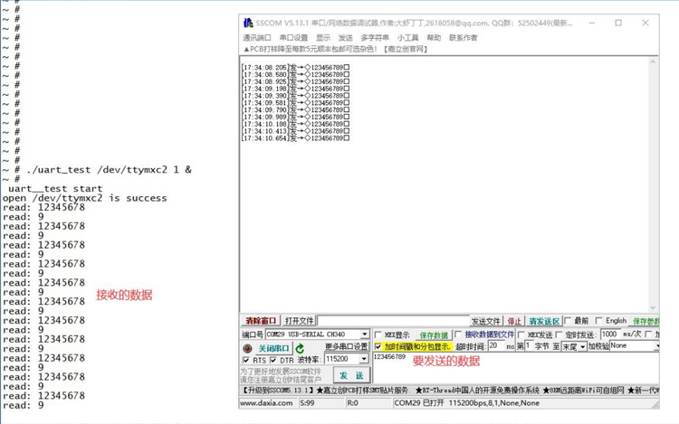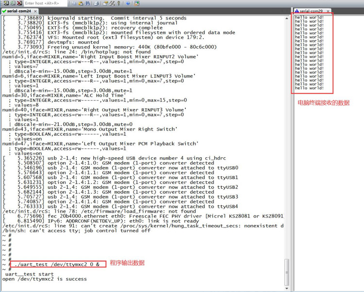 拷貝編譯好的 uart_test 應(yīng)用測試程序到開發(fā)板中,執(zhí)行下面命令進行寫數(shù)據(jù)實現(xiàn):