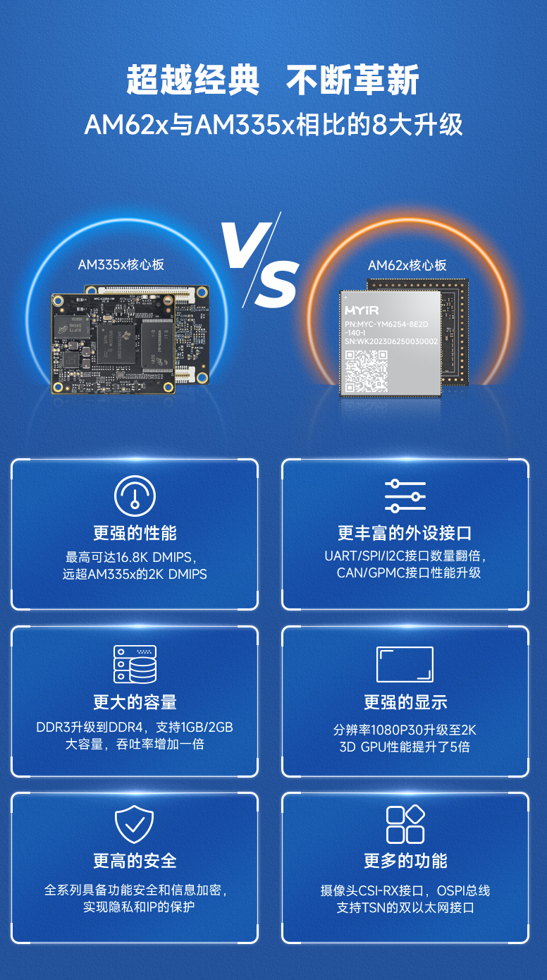 AM335x是TI經典的工業MPU,它引領了一個時代,即工業市場從MCU向MPU演進,幫助產業界從Arm9迅速遷移至高性能Cortex-A8處理器。隨著工業4.0的發展,HMI人機交互、工業工控、醫療等領域的應用面臨迫切的升級需求,AM62x處理器作為TI Sitara™產品線新一代MPU產品,相比上一代經典處理器AM335x具備更高性能及功能擴展性,在內核、GPU、存儲、顯示、安全、外設等6大方面實現性能大升級。