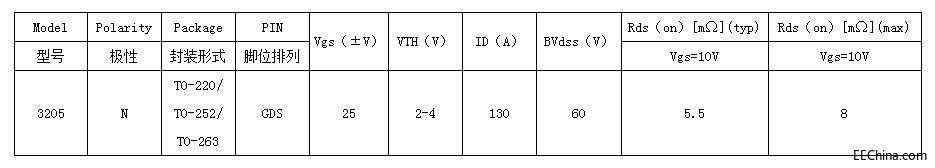 針對(duì)這種需求,飛虹電子研發(fā)出適用于300W/12V輸入的逆變器的前級(jí)電路的FHP3205 MOS管,這款MOS管采用N溝道溝槽工藝,封裝形式為TO-220/TO-252/TO-263,腳位排列是GDS,其他具體參數(shù)請(qǐng)看這里: