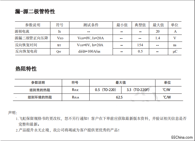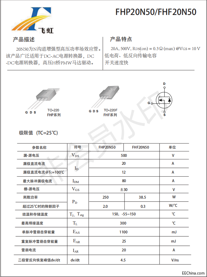 針對(duì)市場(chǎng)上對(duì)優(yōu)質(zhì)MOS管的需求,飛虹電子通過(guò)技術(shù)創(chuàng)新研發(fā)了型號(hào)為FHP20N50 / FHF20N50的高壓MOS管,適用于逆變器的前級(jí)電路,采用TO-220/TO-220F/TO-3PN的封裝形式,腳位排列為GDS,具體參數(shù)請(qǐng)看下圖: