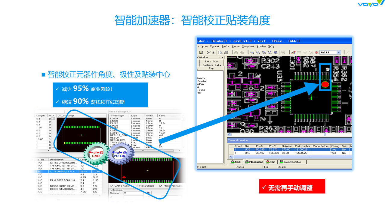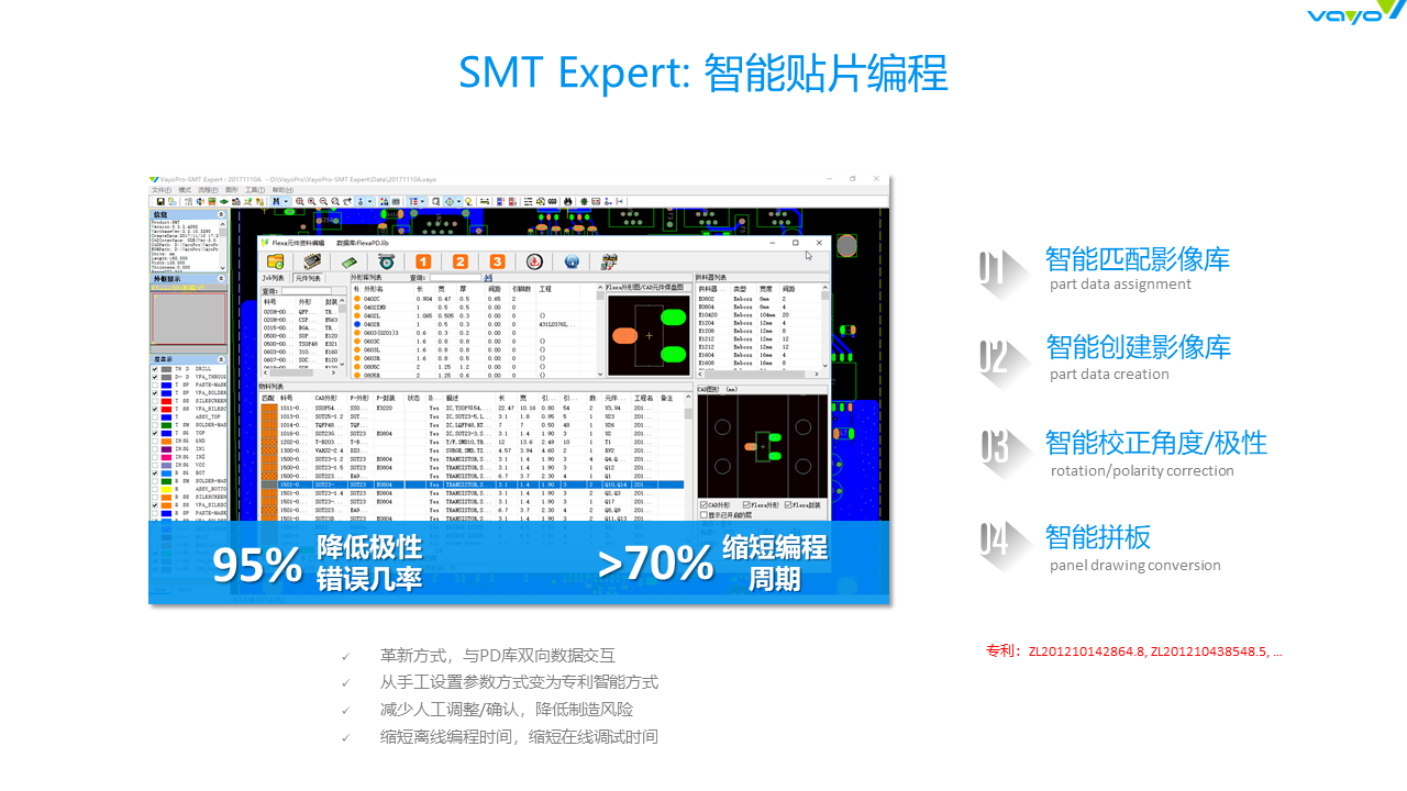 海康SMT編程工程師使用的是一款叫VayoPro-SMT Expert的編程工具軟件,是國內(nèi)望友公司的軟件,使用這套軟件使用CAD數(shù)據(jù)和BOM數(shù)據(jù)可以快速處理生成裝配圖&上料表等,自動校正極性和角度,無需工程師一個個用眼睛確認(rèn),省了80%以上的時間,現(xiàn)在海康專職工程師做一個新產(chǎn)品程序只需十分鐘就能完成。按照10分鐘一個,日夜班2個班別,每個班別1個人即可完成所有程序的制作。
