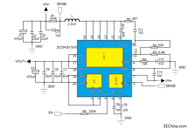 ZCC9430 大功率同步升壓芯片,耐壓3-30V,輸入電流是8A ,封裝是QFN20,內置MOS