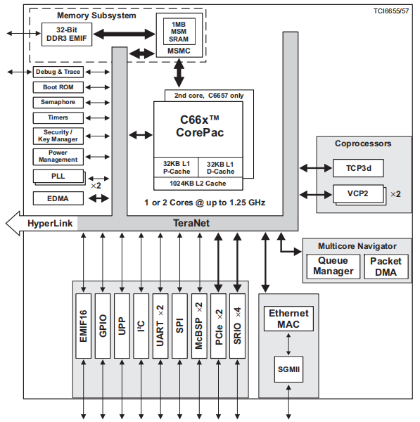 DSP采用TI新一代DSP,擁有兩個 TMS320C66x ™ DSP內核子系統(CorePacs),每個系統都擁有1.25GHz C66x定點/浮點CPU內核。1.25GHz時,定點運算速度為40GMAC/內核。針對浮點@1.25GHz的20GFLOP/內核。
