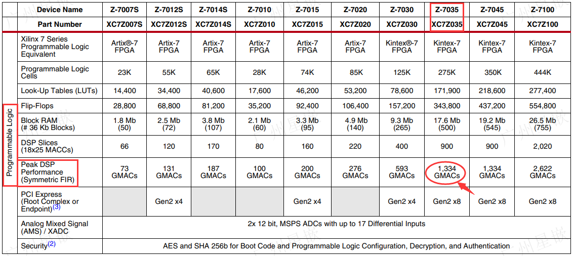 參考Xilinx官方文檔Zynq-7000 SoC Data Sheet: Overview (DS190),可找到Zynq 7035 PL端的MACs指標值為1334 GMACs,約為2668 GFLOPs,如下圖所示: