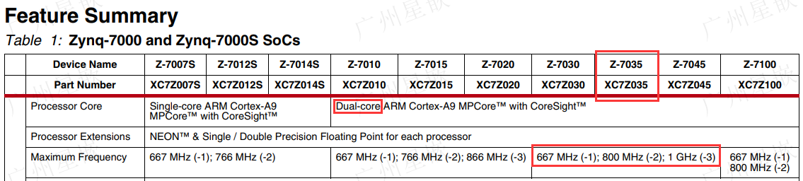 參考Xilinx官方資料Zynq-7000 SoC Data Sheet: Overview (DS190),可獲得Zynq 7035 PS端CPU的性能參數(shù),如下圖紅框標出的地方所示: