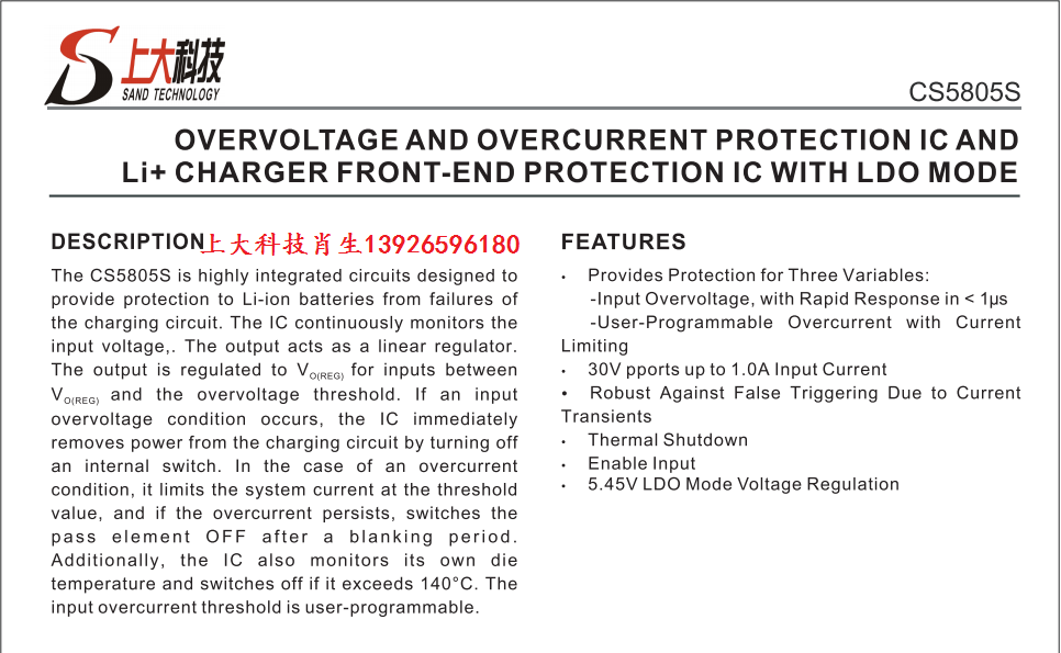 CS5805S封裝SOT23-6L,支持高達1A的輸入電流,5.45V LDO