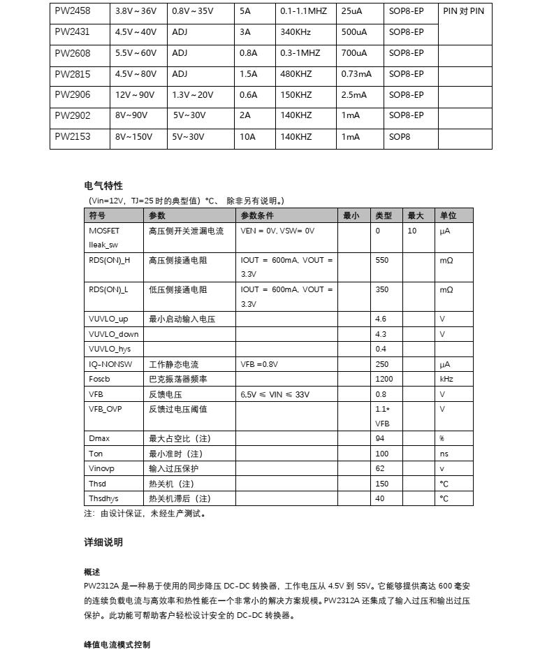 該 PW2312A 是一個高頻,同步,整流,降壓,開關模式轉換器與內部功率 MOSFET。它提供了一個非常簡