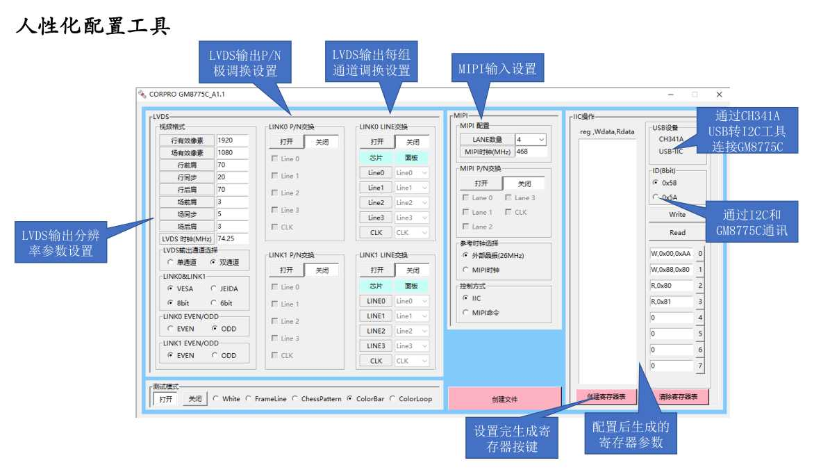 雙擊GM8775C_run.exe即運(yùn)行得到以下界面, 上位機(jī)界面分LVDS 和 MIPI 兩部分,可根據(jù)用戶輸入的參數(shù),綜合出 GM8775C 需要寫(xiě)的寄存器值,用戶將寄存器值寫(xiě)入 GM8775C,即可點(diǎn)亮 LCD,用戶不用詳細(xì)看寄存器表也可以開(kāi)始調(diào)試,縮短產(chǎn)品開(kāi)發(fā)周期。