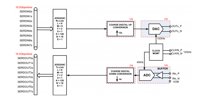 一、衛星數據鏈綜 衛星通信是衛星互聯網的重要應用之一,主要指通過或借助衛星進行數據通信,可廣泛應用于移動用戶、遠程操作、及相關前沿應用領域。衛星通信產業鏈主要涵蓋衛星制造、運載發射與地面設備等基礎設施建設,及其運營服務。 商業航天衛星市場*(主要為低成本近地軌道衛星)快速擴張,現已成為市場發展的驅動力,與之形成對比的是限制多、成本高、海拔高的地球同步軌道(GEO)衛星。隨著這些市場變化的出現,主要的問題之一是需要多少輻射加固。如今,大批量商業航天市場不能承擔成本較高、要求嚴格、耐輻射,并且符合航天標準的“傳統”芯片、元件和設備,并且通常也不需要。 基于1G帶寬的衛星數據鏈是未來6G移動通信的核心技術,以ADI公司AD9988為基礎的射頻收發平臺, 完美解決了 Sub-6G 的通信問題,以 Transceiver 為基礎可以向上擴頻到 X, KA .KU 頻段,以下先講解 KA 頻段衛星通信解決方案。采用 AD9986的接收機和發射機衛星通信系統,整個方案 Sub-6G 模塊可以固定,只需要切換射頻前端就能實現不同頻段的擴頻通信。 該方案推動商業航天衛星產業發展 ● 更低的發射成本 ● 體積更小、重量更輕、價格更加低廉的航天器 ● 對現代IC技術和新功能的需求 ● 對近地軌道任務和更大衛星群的重視 ● 需要縮短產品上市時間 二、FMCJ469-基于AD9988的四路4 GSPS@ 12 bit,四路12 GSPS@16 位4T4R 射頻FMC子卡   2.1 產品詳情 用戶指南介紹了 AD9081-FMCA-EBZ、AD9082-FMCA-EBZ、AD9986-FMCB-EBZ 和 AD9988-FMCB-EBZ 評估板,它們提供操作各種模式和配置下的 AD9081、AD9082、AD9986、AD9988 、AD9207、AD9209 或 AD9177 所需的所有支持電路。還介紹了用于與套件接口的應用軟件。這些評估板連接到 ADI 公司的 ADS9-V2EBZ,以使用 ACE 軟件進行評估。 該評估板還可以與 Xilinx® 或 Intel®的市售現場可編程門陣列 (FPGA) 開發板連接。“AD-FMC-SDCARD 的使用”部分提供了有關如何使用這些平臺來評估 AD9081 或 AD9082 的信息。 ACE 軟件允許用戶在各種模式下設置 MxFE®,以捕獲模數轉換器(ADC) 數據進行分析。DPGDownloaderLite 軟件(包含在 ACE 安裝中)生成矢量,并將其傳輸到數模轉換器 (DAC),然后可以將其發送到頻譜分析儀,進行進一步分析。如需了解更多信息,請參閱 AD9081、AD9082、AD9986、AD9988、AD9207、AD9209 或 AD9177 數據手冊和 UG-1578(套件用戶指南),使用評估板時,必須同時參考用戶指南。 優勢和特點 ● AD9988 的全功能評估板 ● 帶有分析、控制、評估 (ACE) 軟件的 PC 控制軟件。 由 HMC7044 管理套件和 FPGA 時鐘提供板載時鐘。 ● 選擇切換到外部直接時鐘 2.2 AD9988芯片概述 AD9988 是一款高度集成的套件,具有四個 16 位、12 GSPS 最大采樣率、RF 數模轉換器 (DAC) 內核,以及四個 12 位、4 GSPS 速率、RF 模數轉換器 (ADC) 內核。該套件通過 4T4R 配置,支持 4 個變送器通道和 4 個接收器通道。該產品非常適合四天線 TDD 變送器應用,在該應用中,接收器路徑可以在接收器和觀察模式之間共享。可以配置和切換 GPIO 引腳,以支持不同的用戶模式,同時保持相位一致性。在 4T4R 配置中,支持的最大射頻通道帶寬為 1.2 GHz,采樣分辨率為 16 位。AD9988具有一個 16 通道 24.75 Gbps JESD204C 或 15.5 Gbps JESD204B 串行數據端口,其中每個變送/接收鏈路最多可支持八個通道,還有一個片內時鐘乘法器,并具有針對直接面向 RF 射頻應用的多頻帶的數字信號處理能力。