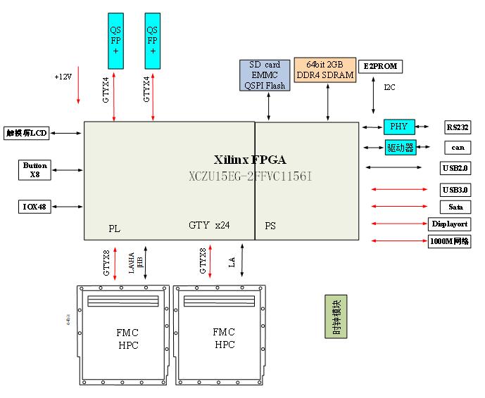 圖 2:ZU15EG板卡原理框圖 3.2 技術指標 ● PS端掛載一簇DDR4,數據位寬64-bit,容量32Gb,最高可穩定運行在2400MT/s; ● PS端掛載兩片QSPI x4 NorFlash,每片容量512Mb,用于系統配置程序存儲; ● PS端掛載掛一片EMMC,64Gb容量,可用于系統配置程序存儲; ● PS端外掛SD卡接口,最大支持搜索8192個文件數,可用于系統配置程序存儲; ● PS端外接Display Port接口,支持Display Port 1.2a協議標準,僅支持對外輸出; ● PS端外接一路千兆以太網接口,支持10/100/1000Mbps速率傳輸; ● PS端外接一路USB3.0接口,最大速率可達5Gbps; ● PL端掛載一片SPI接口的DataFlash,容量16Mb,可用于存儲系統參數信息; ● PL端通過SPI外接兩組獨立CAN FD控制器,CAN FD接口最高速率可達5Mbps; ● PL端外接2路QSFP+接口,最高支持40Gbps數據傳輸速率; ● PL端外接2組FMC總線,支持1組8個GTH,LA,HA,HB總線,另外1組8個GTH,LA總線; ● 板卡外接兩路RS232接口,由PS端UART轉出,可用于系統調試及狀態信息打印; ● 板卡留有多路用戶自定義測試IO管腳; ● 板卡留有一組4位用戶自定義撥碼開關; ● 板卡芯片全部采用工業級芯片; 3.3 軟件內容 ● PS端QSPI加載測試代碼; ● PS端EMMC加載測試代碼; ● PS端SD卡加載測試代碼; ● PS端Display Port接口測試代碼; ● PS端USB3.0接口測試代碼; ● PS端DDR4讀寫測試代碼; ● PS端千兆網口收發測試代碼; ● PS端UART接口讀寫測試代碼; ● PL端SPI接口的DataFlash讀寫測試代碼; ● PL端QSFP+接口ibert模式測試代碼; ● PL端CAN FD接口測試代碼; ● 其它GPIO信號連通性測試代碼; 3.4 物理特性 ● 工作溫度:商業級 0℃ ~ +55℃,工業級-40℃~+85℃ ● 工作濕度:10%~80% 3.5 供電要求 ● 單電源供電,整板最大功耗:30W ● 電壓:+12VDC±10%@5A 3.6 應用領域 ● 高速信號處理、車載雷達信號處理等。 3.6.1 產品應用 ● 無線通信基礎設施 ● W-CDMA、LTE、LTE-A、大規模多輸入多輸出(MIMO) ● 點對點微波、E 波段和 5G mmWave ● 寬帶通信系統 ● DOCSIS 3.0+ 電纜調制解調器終端系統 (CMTS) ● 通訊測試與測量系統