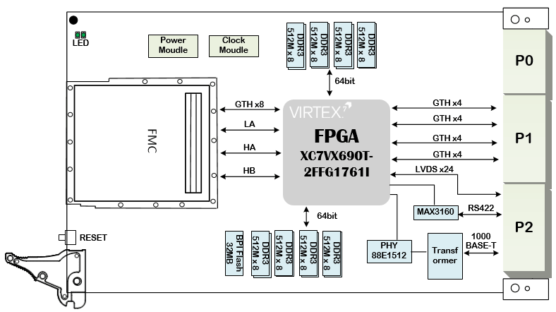 板卡功能 | 參數(shù)內(nèi)容 | 主處理器 | Xilinx XC7V690T-2FFG1761I | 板卡標(biāo)準(zhǔn) | VPX VITA 46.0 | 電氣規(guī)范 | PCIe 2.0,3.0 X4 | FMC接口 | FMC ANSI/VITA 57.1 – 2008 ,ASP-134486-01 HPC中LA,HA,HB全部接口和DP0~DP7 8路高速接口 | 板載緩存 | 兩組DDR3,每組512Mx64bit(4GB), MT41K512M8RH-125-IT | 加載Flash | BPI加載模式,BPI Flash 2Gb | VPX接口 | P1: GTX x16, 支持PCIe、SRIO協(xié)議 P2: LVDS x24,一路RS422,一路1000Base-T | 仿真器接口 | 1x 6Pin JTAG接口,間距2.54mm | LED | 兩個(gè),電源狀態(tài)指示燈,F(xiàn)PGA狀態(tài)指示燈(可編程) | 復(fù)位方式 | 外復(fù)位 | 板卡尺寸 | 100mm x 160mm x20mm | 板卡重量 | (含散熱片) | 板卡供電 | +12V@4A | 板卡功耗 | 48W | 工作溫度 | Industrial -20℃到+70℃ |