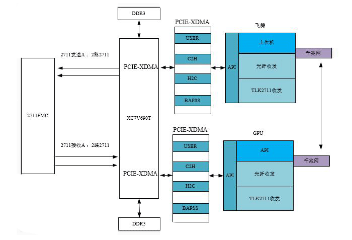 4路TLK2711接口,2路作為發(fā)送端口,2路作為接收端口,每路接口互不影響。 接收端:數(shù)據(jù)流從TLK2711接收端進(jìn)來,存到FPGA的DDR中,然后通過PCIE導(dǎo)入到GPU中。 發(fā)送端:數(shù)據(jù)存在飛騰主板中,飛騰通過PCIE寫入FPGA的DDR中,F(xiàn)PGA取走數(shù)據(jù),通過TLK2711發(fā)送端口發(fā)送出去。 GPU接收的數(shù)據(jù)通過千兆網(wǎng)發(fā)送到飛騰主板中。