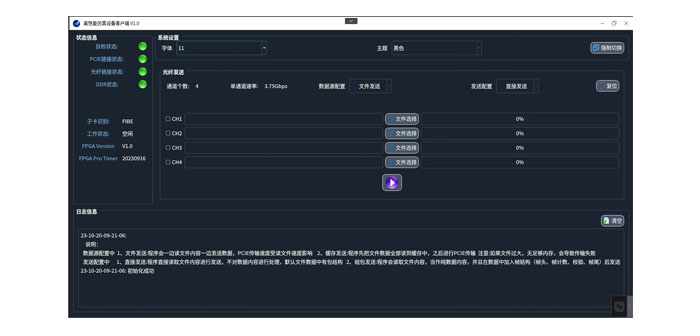 3.6飛騰GPU數(shù)據(jù)交互 在背板設(shè)計(jì)中,飛騰主板和GPU千兆網(wǎng)互聯(lián)和RS232互聯(lián)。考慮傳輸速度,使用千兆網(wǎng)進(jìn)行傳輸。使用TCP/IP協(xié)議,飛騰處理器為TCP服務(wù)端,GPU為TCP客戶端主動進(jìn)行鏈接請求。 3.7 客戶端界面 客戶端具有狀態(tài)信息顯示,控制四通道光纖數(shù)據(jù)發(fā)送或者雙通道TLK2711接口數(shù)據(jù)發(fā)生功能。上位機(jī)自動識別FPGA子卡類型,切換操作界面。 四通道光纖子卡界面 雙通道TLK2711子卡界面   |