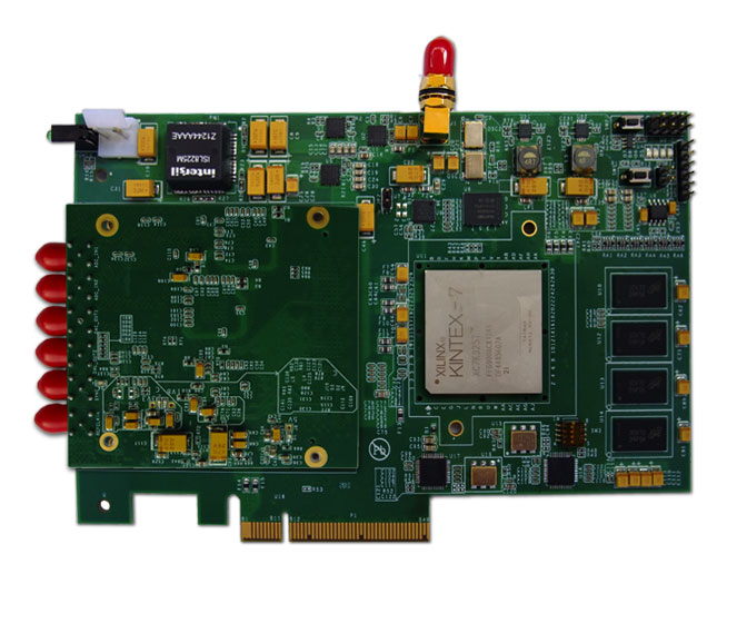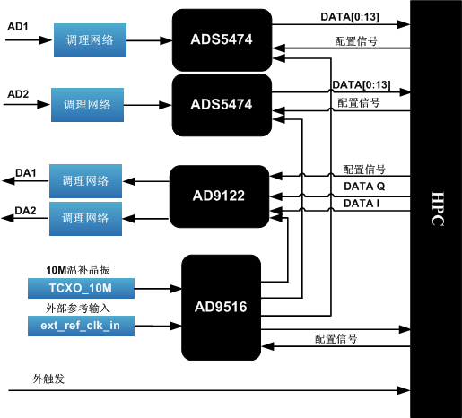 一、概述 該板卡可實現2路14bit 400Msps AD 和2路16bit 400Msps DA功能,遵循 VITA 57 標準,板卡可以直接與VME/VXS/AMC/VPX/PCI-E FPGA 載板連接使用,用于模擬信號、中頻信號采集,信號發出等應用,是xilinx開發板設計的標準板卡。  二、 性能指標板卡功能 | 參數 | 內容 | ADC | 芯片型號 | ADS5474 | 路數 | 2路ADC | 采樣率 | 400MSPS | 數據位 | 14bit | 數字接口 | DDR LVDS | 模擬接口 | 交流耦合 | 模擬輸入 | ±1V | 輸入阻抗 | 50Ω | 模擬指標 | | DAC | 芯片型號 | AD9122 | 路數 | 2路DAC, | 轉換率 | 600Msps,插值1.2Gsps | 數據位 | 16bit | 數字接口 | DDR LVDS | 模擬接口 | 交流耦合 | 模擬輸出 | ±1V | 輸出阻抗 | 50Ω | 模擬指標 | 信噪比SNR:69.327dBFS | 時鐘 | PLL芯片 | AD9516 | 板載晶振 | 溫補晶振 10MHZ | 外輸入時鐘 | SSMB接口切換 | 外觸發 | 路數 | 1路輸入 | | 電平 | 3.3V LVTTL電平 | 連接器類型 | FMC-LPC | ASP_134604_01 | | 前面板 | 6路 SSMB | 板卡標準 | FMC ANSI/VITA 57.1 - 2008 | 板卡尺寸 | 69mmX90mm | 板卡重量 | (含散熱片) | 板卡供電 | +12V@1A | 板卡功耗 | 8W | 工作溫度 | Industrial -20℃到+70℃ | 支持母板 | Xilinx board | V6、V7、KU、VU、 ZYNQ、ZU 開發板 | Orihard board | 136、270、367、288、330、274、3、9 |