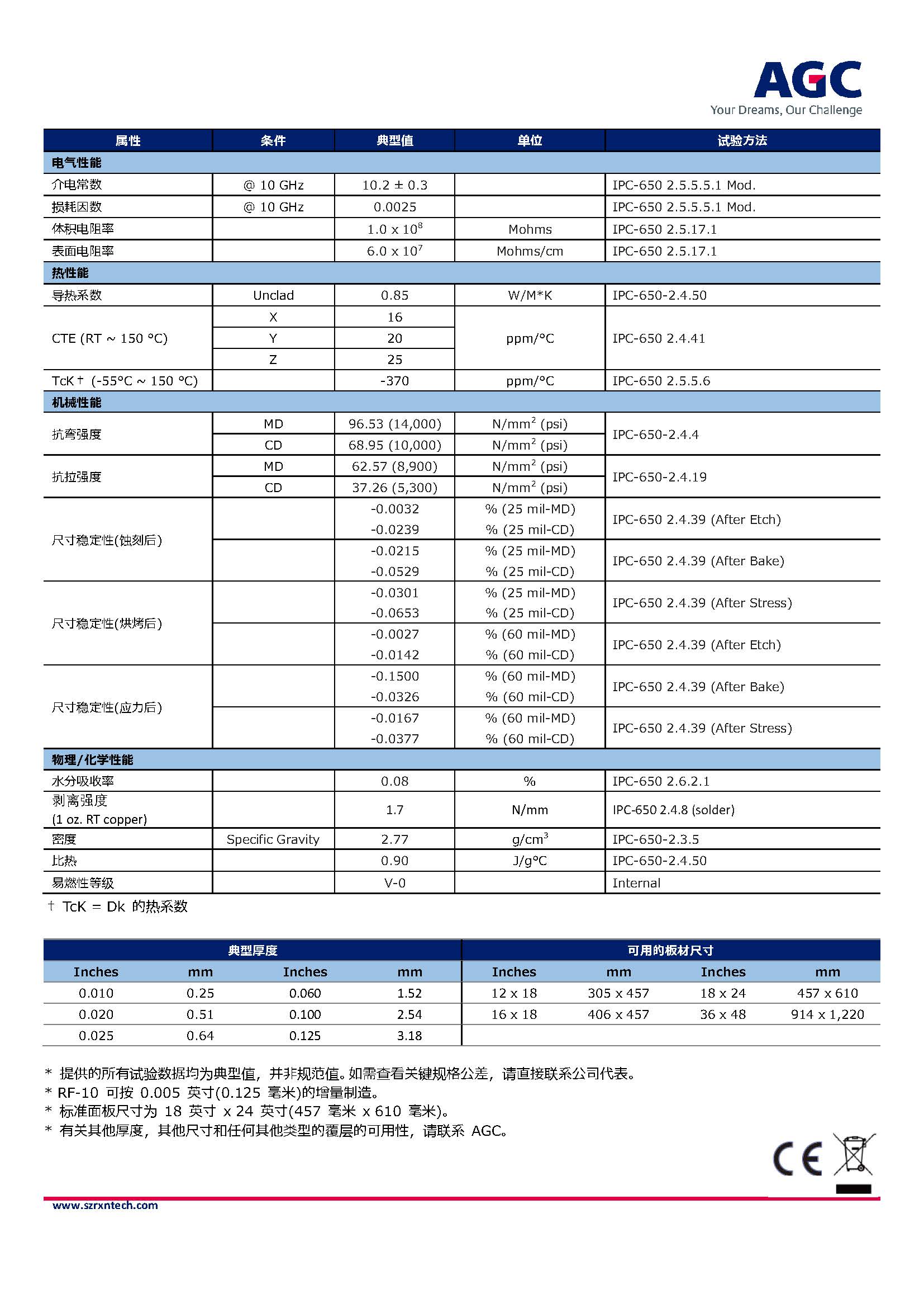 AGC_RF-10高頻高速高功率射頻PCB覆銅板