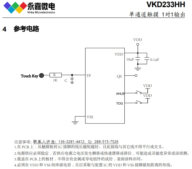 VKD233DH/HH 工作電壓/工作電流/待機電流:2.4V-5.5V/4.0μA/1.5μA(3V) 感應通道數:1 輸出方式:直接/鎖存輸出 最長響應時間快速模式60ms,低功耗模式220ms @VDD=3V 封裝:SOT23-6 低功耗/長按16S復位