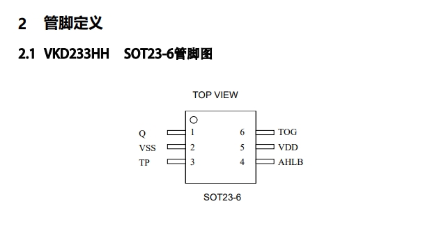 VKD233DQ/HQ 工作電壓/工作電流/待機電流:2.4V-5.5V/4.0μA/---(3V) 感應通道數:1 輸出方式:直接/鎖存輸出 最長響應時間快速模式46ms @VDD=3V 封裝:SOT23-6 長按16S復位