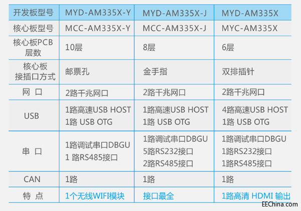 功能區別上,三款開發板都有2路千兆網口、1路CAN總線、1路調試串口、1路USB OTG,其他接口如USB HOST、RS232、RS485、板載WIFI、HDMI等稍有不同,參考如下表。