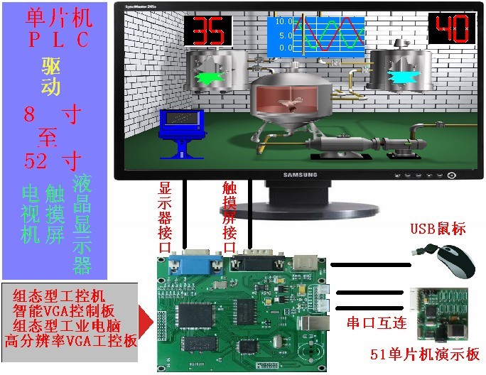 有了VGA控制板/組態(tài)型工控機(jī),您只需一個(gè)普通51單片機(jī)就可以作出豐富的人機(jī)界面,真正實(shí)現(xiàn)了用單片機(jī)“小牛推大車(chē)”。單片機(jī)或PLC就可以驅(qū)動(dòng)8寸至52寸等大尺寸高檔液晶顯示器或者電視機(jī)。