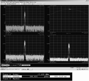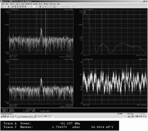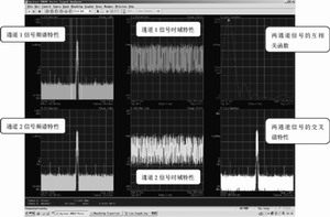 測試結果(見圖1)表明,利用Agilent 89601A+81204A 可完成對兩路相參調制信號時間差值參數的測試。相關函數峰值的數值為兩路信號間的時間差。Agilent 89601A 矢量分析軟件可同時顯示兩路獨立信號的頻譜、時域和相關運算等參數。提供對多路信號的完成測試能力。