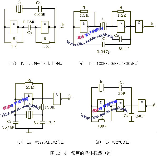 (c)、(d)為CMOS器件組成的晶體振蕩電路, 一般用于電子表中,其中晶體的f0=32768Hz。