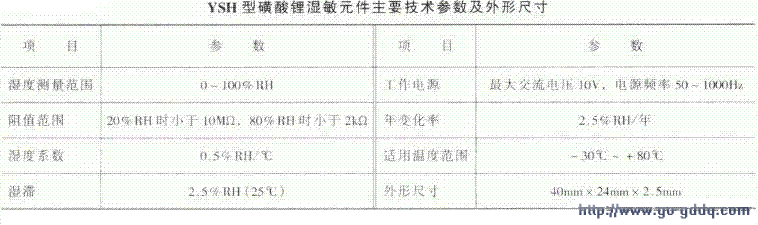 YSH型磺酸鋰濕敏元件具有全濕度量程、使用環(huán)境溫度范圍寬、穩(wěn)定性高、響應(yīng)快、壽命長、抗水蝕、抗污染等特點,YSH型磺酸鋰濕敏元件廣泛用于紡織、食品、煙草、化工及電子等工業(yè),以及氣象、科研、國防及農(nóng)業(yè)生產(chǎn),特別適合在較惡劣的室外環(huán)境下使用。YSH型磺酸鋰濕敏元件主要技術(shù)參數(shù)及外形尺寸見表。