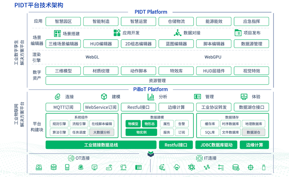 PiDT平臺(即工業數字孿生平臺軟件)是⼀款基于零代碼的數字孿⽣領域可視化系統。PiDT充分利⽤