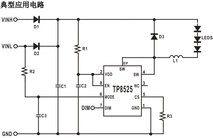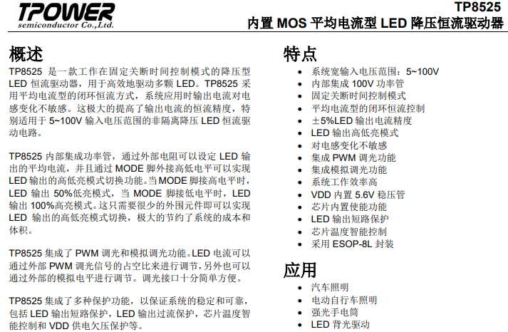天源TP8525 2.5A平均電流型 LED 降壓恒流車燈IC