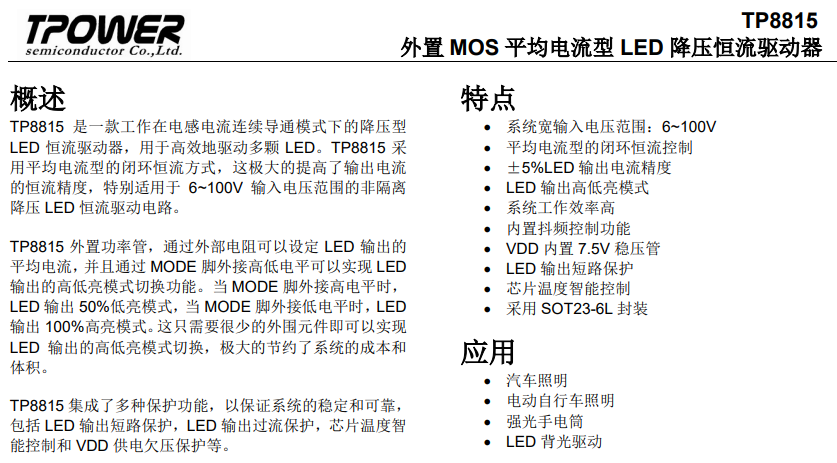 天源TP8815 采用平均電流型的閉環恒流方式,這極大的提高了輸出電流的恒流精度,特別適用于 6~100V 輸入電壓范圍的非隔離降壓