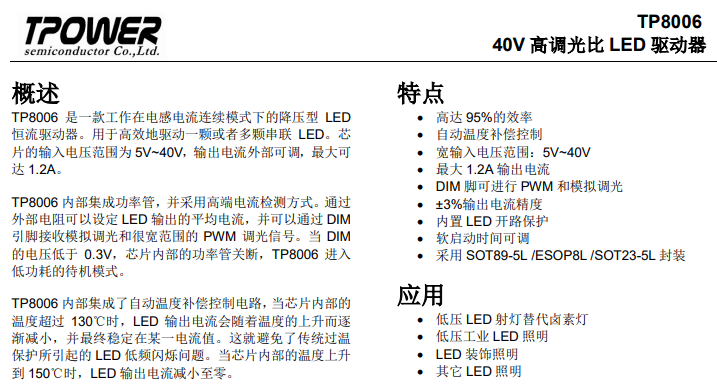 天源TP8006 40V 高調光比 LED 驅動器 方案應用等技術