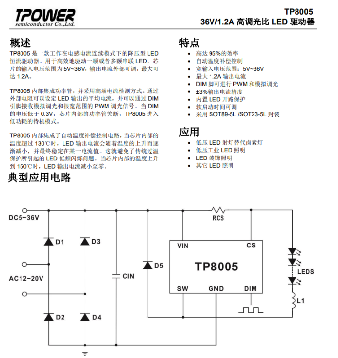 天源TP8005 36V 1.2A 高調光比 降壓型 LED 芯片