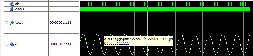 vcc是我設置的一個固定電平,q1是用用計數器+rom產生的正弦波,alb是vcc和q1經過比較器后的輸出波形,q1