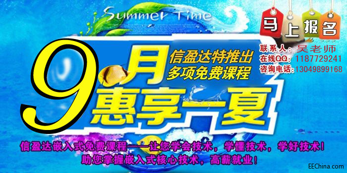 深圳信盈達嵌入式培訓學院迎中秋活動:周末及節假日免費體驗嵌入式課程,來訪者贈送精美學習資料,報名者即送現金券。名額有限,需要的朋友抓緊時間吧!!!詳情聯系吳老師Q1187729241 電話:13049899168 活動詳情可進入 http://www.edu118.com/plus/list.php?tid=66 |