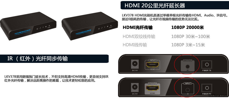 高清HDMI光纖傳輸器音視頻信號傳輸20公里 HDMI光纖傳輸器光端機(LKV378) 1、LKV378是一個高性能,低功耗,HDMI光纖傳輸系統(tǒng)。 2、通過一條單模光纖可以傳輸一路單向HDMI視頻,立體聲音頻。 3、這種獨特的光纖 ...