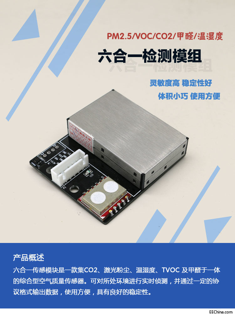六合一傳感模塊是一款集 CO2、激光 PM2.5、溫度、濕度、TVOC 及甲醛于一體的綜合型空氣質量傳感器。可對所處環境進行實時偵測,并通過一定的協議格式輸出數據,使用方便,具有良好的穩定 ...
