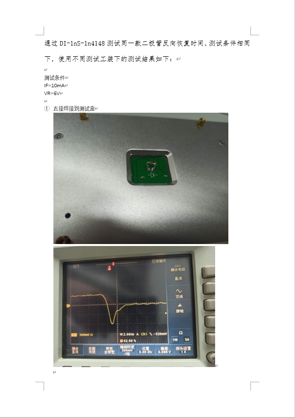 通過DI-1nS-1n4148測試同一款二極管反向恢復時間,測試條件相同下,使用不同測試工裝下的測試結果如下: 測試條件IF=10mAVR=6V