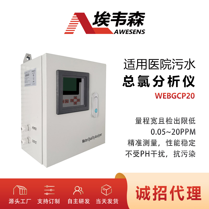 埃韋森醫療污水總氯在線分析檢測儀WEBGCP20,標配德國高精度消毒劑傳感器,采用了三電極覆膜電流法的工作原理,量程寬且檢出限低,測量精準性能穩定,內置溫度傳感器自動補償溫度,抗表面活性劑,抗污染,具有離子選 ...