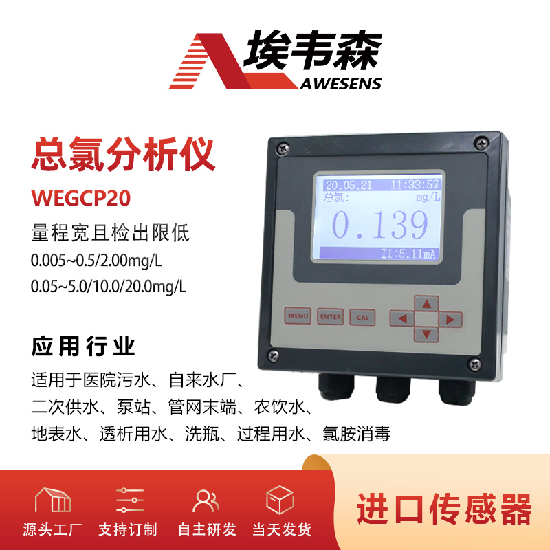 埃韋森在線總氯分析檢測儀WEGCP20是帶微處理器的水質在線監測儀。配高精度傳感器,量程寬且檢出限低,響應快,低維護,自帶溫度補償,不受pH影響,抗表面活性劑,抗污染,無需零點校準,單點標定即可。操作簡單:菜 ...