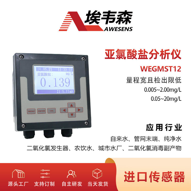 埃韋森在線亞氯酸鹽分析檢測儀WEGMST12是帶微處理器的水質在線監測儀。配高精度傳感器,量程寬且檢出限低,自帶溫度補償,低維護,響應靈敏,零點穩定,現場僅需一點標定即可,LCD液晶顯示屏,智能型中/英文菜單,菜 ...
