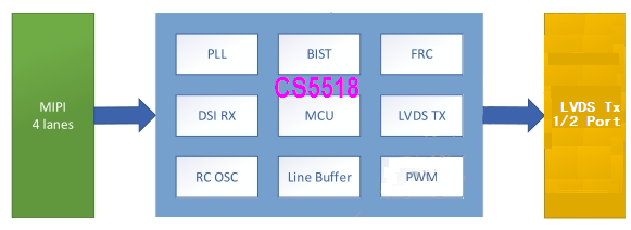 CS5518是一款MIPI DSI輸入與1或2Port LVDS輸出轉換芯片。Pin toPin替換GM8775C!MIPI DSI最多支持4Lane,1Lane最大運行速率為1Gbps。LVDS支持18或24位像素,25MHz至154MHz,支持VESA或JEIDA格式。單路1.8V供電方式, ...