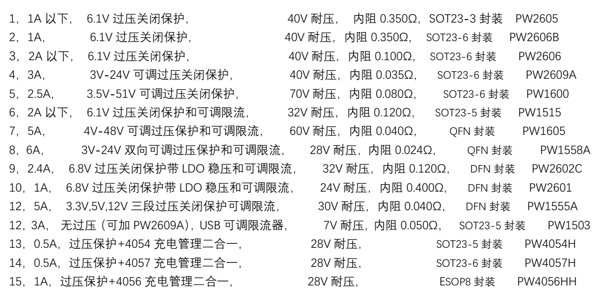 OVP過壓:防止輸入尖峰高壓和高壓輸入時,導(dǎo)致后面電路或IC損壞,如達(dá)到輸入過壓關(guān)閉閾值6.1V以上時,輸出為0V。 OCP限流:限制最大通過電流值。超過如:如恒流;打;關(guān)閉需要輸入重新上電激活(僅PW2602C屬于)三 ...