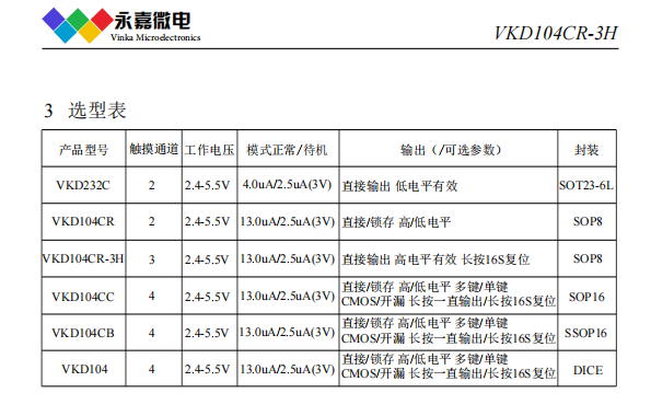 VKD104CR-3H是3通道觸摸檢測芯片,功耗低、工作電壓范 圍寬以及穩定的觸摸檢測效果可以廣泛的滿足不同應用的需求,此觸摸檢測芯片是專為取代傳統按鍵而設計,內建穩壓電路,提供穩定電壓給觸摸檢測電路使用,觸摸檢 ...