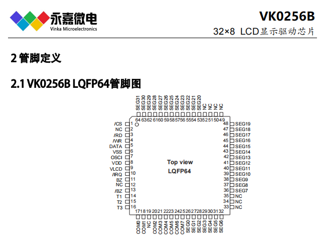 VK0256B是一個點陣式存儲映射的LCD驅動器,可支持最大256點(32EGx8COM) 的LCD屏。單片機可通過3/4線串行接口配置顯示參數和發送顯示數據,也可通過指令進入 省電模式。LJQ6957產品品牌:永嘉微電/VINKA 產品型號 ...