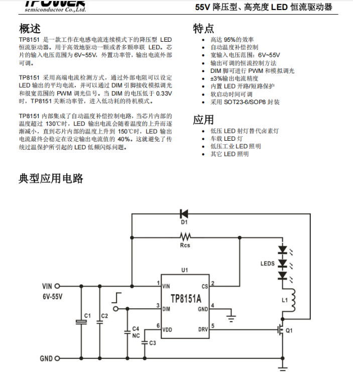 概述 TP8815 是一款工作在電感電流連續(xù)導(dǎo)通模式下的降壓型 LED 恒流驅(qū)動器,用于高效地驅(qū)動多顆 LED。TP8815 采 用平均電流型的閉環(huán)恒流方式,這極大的提高了輸出電流 的恒流精度,特別適用于 8~100V 輸入電壓 ...