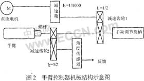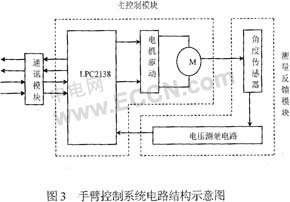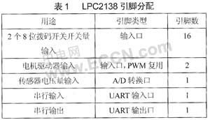 近年來,隨著MEMS及相關技術的發(fā)展,微機器人領域已越來越來受人關注。但由于零件的尺寸很小,微機器人組件的裝配需要很高的精確度,一般的裝配方法無法滿足要求。本文介紹了一個可進行微零件裝配工作的機器人手臂控制系統(tǒng)的控制方法。 1 系統(tǒng)結構 考慮到多機器人手臂的使用,整個機器人控 制系統(tǒng)由上位機與多個下位機組成。下位機即是手臂控制器,每個下位機控制一個機械手臂的伸縮運動。上位機即為控制終端,通過不同配件組裝方式生成每個手臂 的位置數(shù)據(jù),并通過數(shù)據(jù)線傳輸給各個下位機,由下位機控制手臂到達目標位置并進行目標操作。整個系統(tǒng)的結構框圖如圖1所示。 ![]() 1.1 機械結構 如圖2所示,手臂控制器的機械結構由直流減速電機、手臂、螺桿、減速齒輪、角度傳感器組成。機器人手臂與機械螺桿相連,螺桿與直流減速電機通過減速齒輪耦合,各個手臂控制器通過控制電機轉動來達到控制手臂位置的目的。同時,手臂控制器具有手動調節(jié)旋柄與螺桿相連,需要時可通過手動調節(jié),改變手臂位置。 ![]() 1.2 電路結構 手臂控制器由使用ARM內(nèi)核的PHLIPS LPC2138系列微處理器控制,電路結構主要分為主控制模塊、測量反饋模塊和通信模塊,如圖3所示。通過主控制模塊控制電機狀態(tài),通過測量反饋模塊得到螺桿移動距離和位置,在達到規(guī)定位置后停止電機。而通信模塊則完成與上位機之間的數(shù)據(jù)交換。 ![]() 2 電機控制 電機控制由主控制模塊和測量反饋模塊共同完成。 2.1 主控制模塊 LPC2138引腳分配如表1所示。 ![]() 主控制器使用PHLIPS LPC2138微處理器, 其具有64個引腳,31個雙向I/O口,2個8路10們A/D轉換器,能夠進行電壓測量的工作,符合設計要求,其引腳分配如表1所示。電機使用RA- 20GM-SD3 型直流減速電機,其減速箱的減速比達到了1/1000,在減速后,電機轉速為4.5+/-0.9 rpm,在與1/2減速齒輪組進一步 耦合后,螺桿轉速為2.25 rpm,在所用螺桿齒距為1mm時,手臂移動述牢為3.75×10-2mm/s。 由于本設計中電機需要正反轉動,故選用了橋路驅動芯片TA8409,其具有兩個輸入口,兩個輸出口。微處理器通過控制輸入電平組合即可控制電機的不同狀態(tài),包括正轉、反轉、剎車減速和停止狀態(tài)。 它的輸出電壓與電機工作電壓相符,即可直接驅動電機,不用增加放大電路。 電機驅動電路圖如圖4所示。