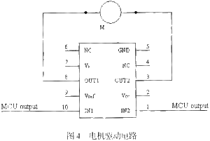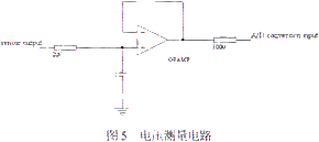 2.2 測量反饋模塊 角度傳感器采用了Midori的CP-2FC,它的機械角度范圍為360度無限,傳感器把角度變化量轉化為電壓量并通過電壓測量電路反饋回微處理器A/D轉換口,通過電壓的變化量可計算得到螺桿的移動距離,這樣就可以得知手臂位置,并以這個為標準對電機驅動器發(fā)送命令。 電壓測量電路包含由運算放人器構成的電壓跟隨電路,如圖5所示,它既可隔離電路,又可以完成電壓跟隨。