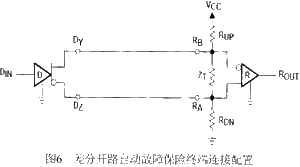 3 通信模塊 3.1 RS-422通信標準 RS-422標準的數(shù)據(jù)信號采用差分傳輸方式,也稱作平衡傳輸,其全稱是“平衡電壓數(shù)字接口電路的電氣特性”。 其接收器采用高輸入阻抗,發(fā)送驅動器有比RS232更強的驅動能力,故允許在相同傳輸線上連接多個接收節(jié)點,最多可接10個節(jié)點。即一個主設備(Master),其余為從設備(Salve),從發(fā)備之間不能通信,所以RS-422支持點對多的雙向通信。 RS-422的最大傳輸距離為4000英尺(約1219m),最大傳輸速率為10Mbit/s。 3.2 數(shù)據(jù)交換功能實現(xiàn) 本系統(tǒng)通信模塊采用RS-422標準,線路長度約為200m,故通信的可靠性可得到保證。差分線路驅動器使用AM26LS31芯片,差分接受器使用 AM26LS32芯片,微處理器的串行輸出口和輸入口分別與驅動器輸入和接收器輸出相連,并使用差分開路自動故障保險終端連接配置。 差分開路自動故障保險終端連接配置圖如圖6所示。