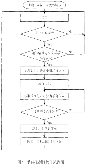從而在發(fā)送器輸出端為高阻狀態(tài)時保證接受器輸入有至少200mV的電壓信號,使輸出不會出現(xiàn)未知的狀態(tài),提高可靠性,完成與上位機間的數(shù)據(jù)交換工 作。另外,考慮到多機器人手臂的應用情況,在手臂控制器中設有撥碼開關來設定編號,與上位機的數(shù)據(jù)交換必須包含該編號,并由此來判斷通信時目標控制器的具 體位置。 4 軟件設計 在設計了手臂控制器硬件的基礎上,我們設計了運行在微處理器上的軟件應用程序。主程序流程圖如圖7所示。