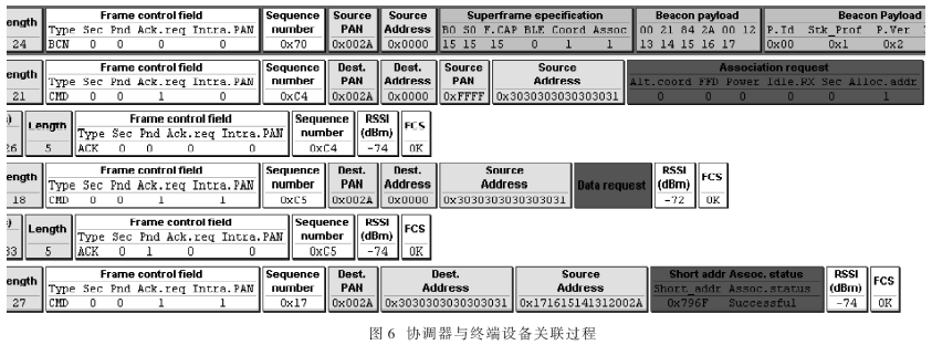 2.3 組網(wǎng) 利用數(shù)據(jù)分析儀[3]記錄監(jiān)控協(xié)調(diào)器與終端設(shè)備的組網(wǎng)過程如圖6所示。